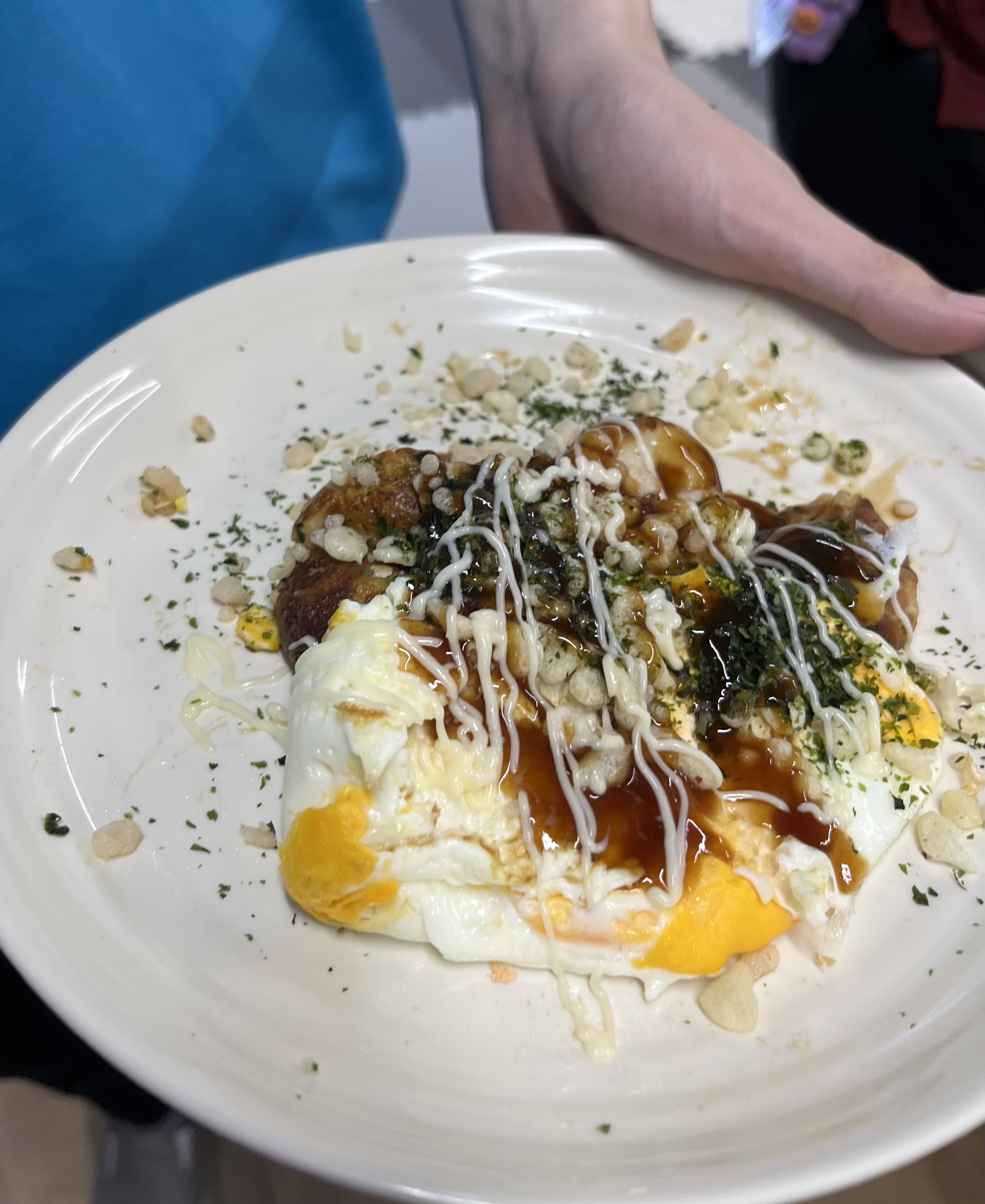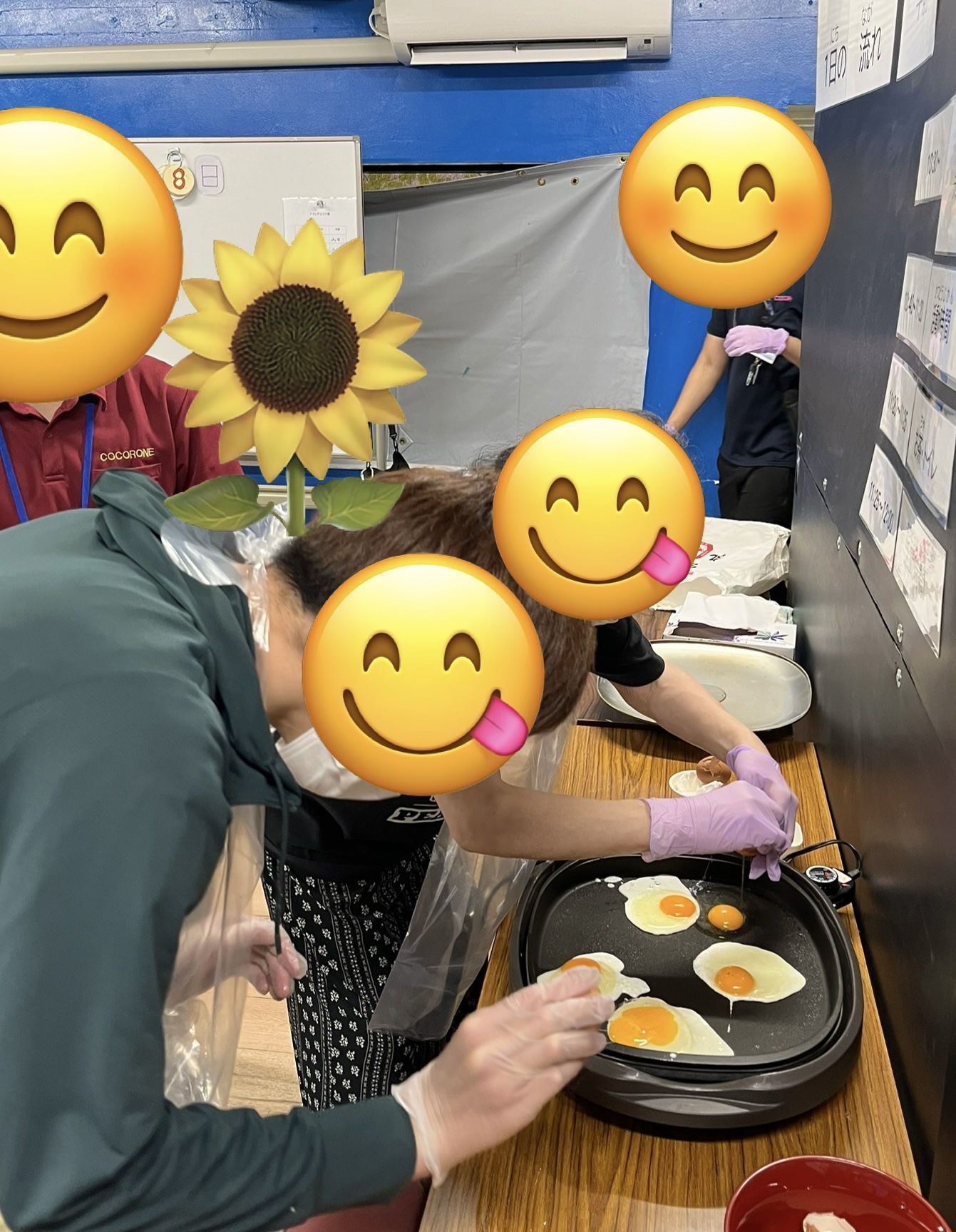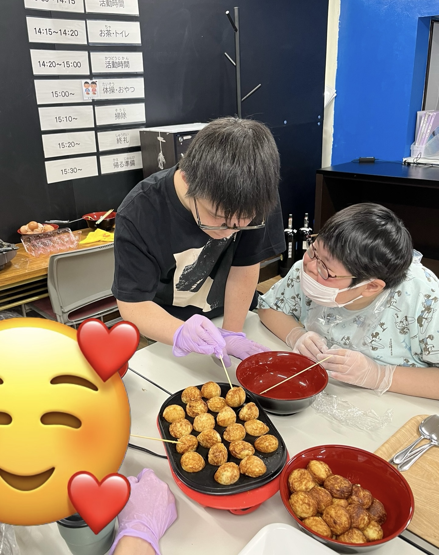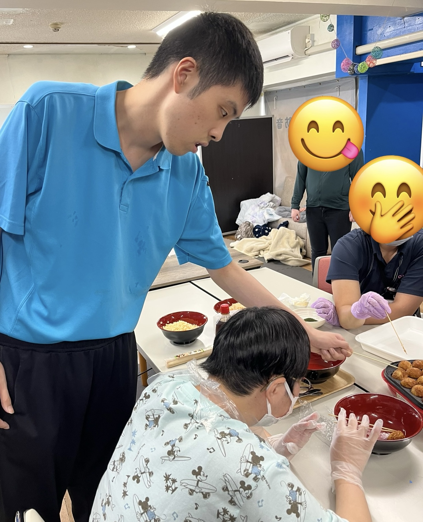 調理担当の利用者さんが、トッピング係になりたこせんを仕上げました。