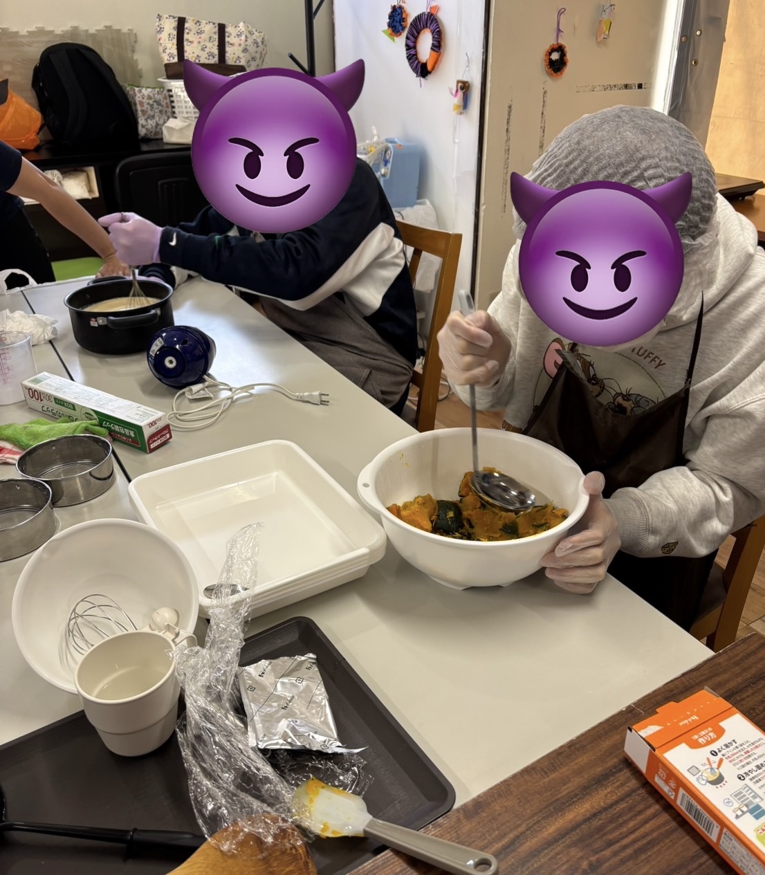 お楽しみのクッキングはカボチャを使ったプリンです。