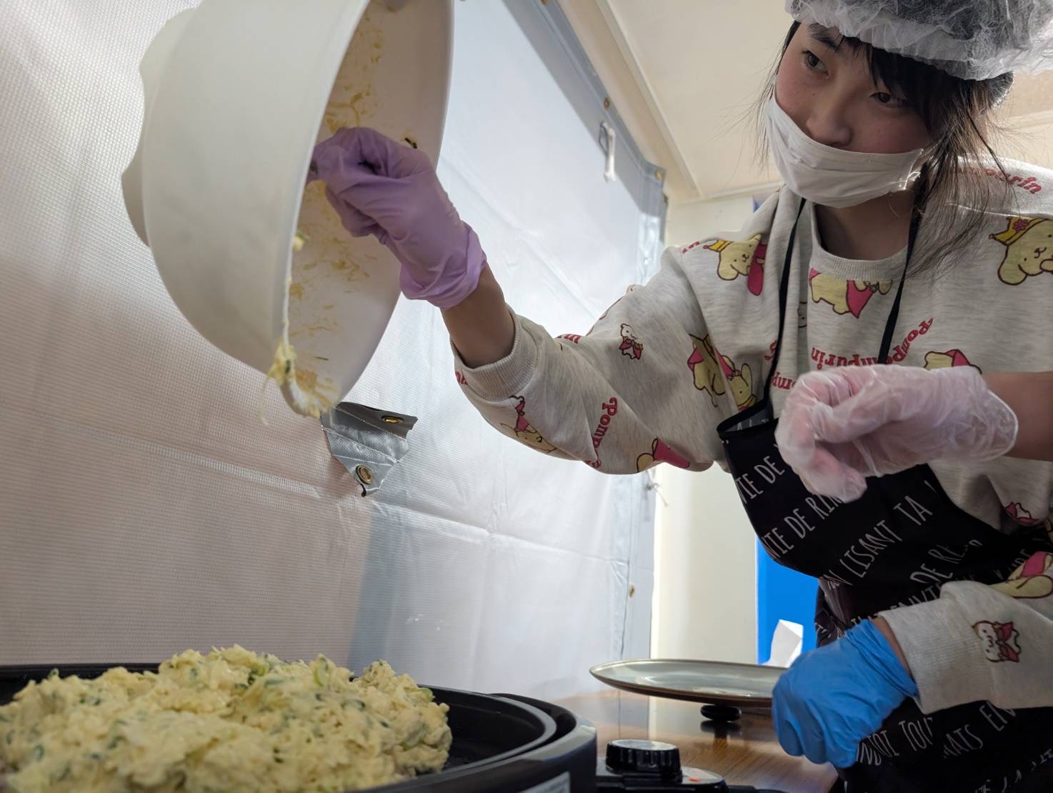キャベツ、ねぎ、天かすも入れてみなさんで協力!