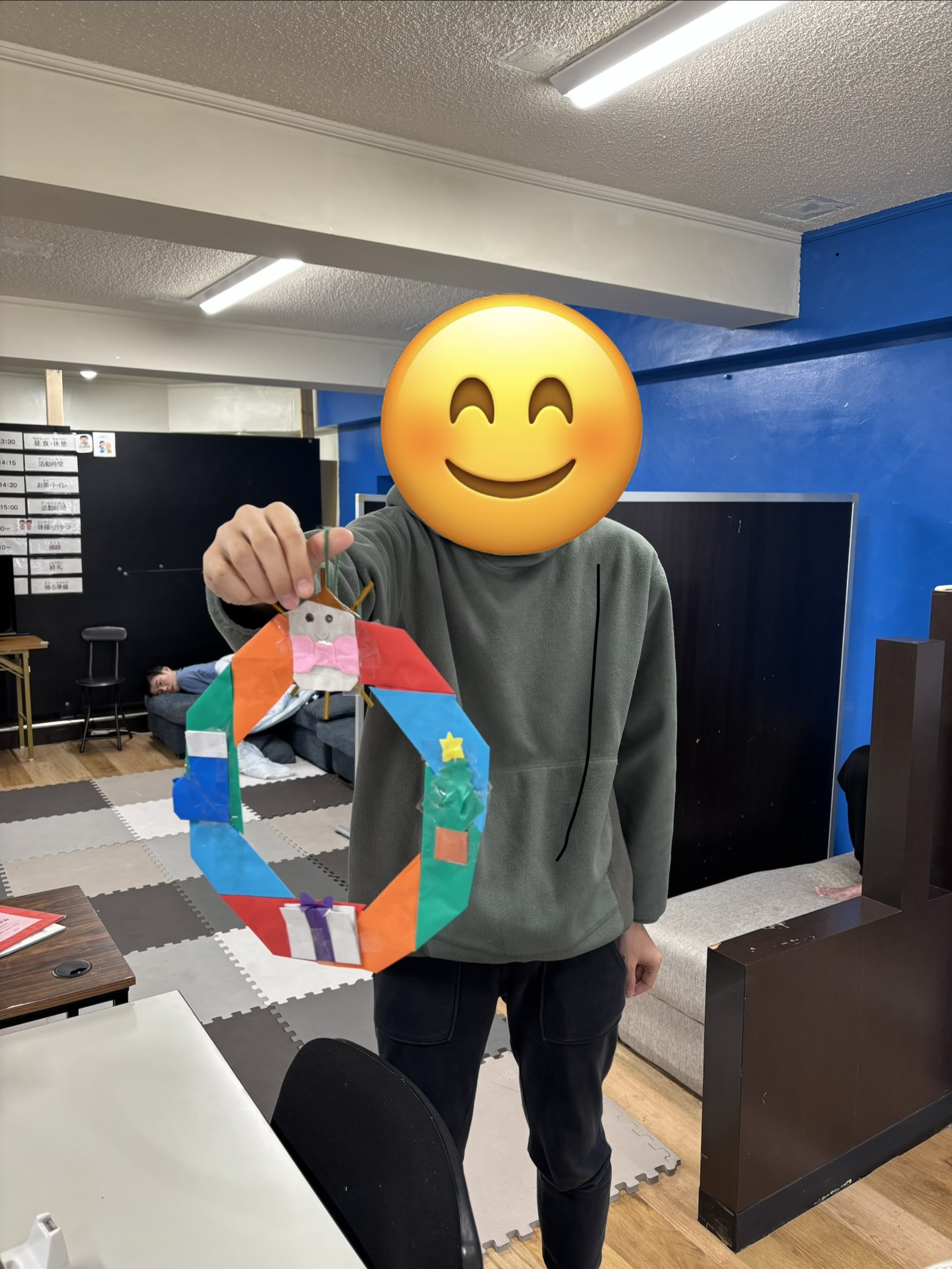 折り紙でサンタの飾りやリースを折ってくださったり、リースに飾りを貼ったりと、
